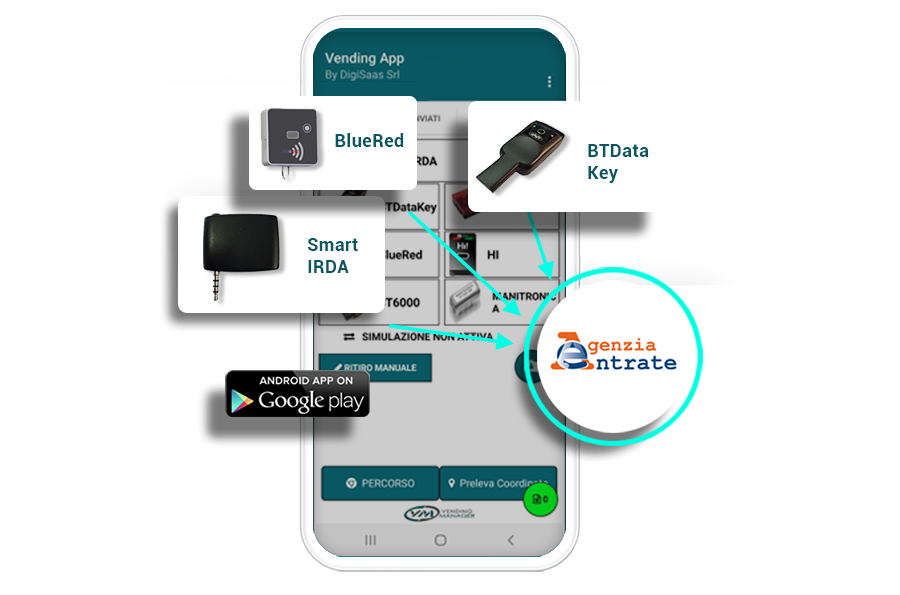 Vending Manager permette di trasmettere i corrispettivi telematici attraverso l’innovativa Vending App che, grazie ad un’interfaccia semplice ed intuitiva pensata per piccoli, medi e grandi gestori coniuga la trasmissione dei corrispettivi all’Agenzia delle Entrate al controllo dell’intera azienda vending, permettendo al contempo di rilevare i dati dai sistemi di pagamento più comuni e utilizzati, con e senza porta di comunicazione.