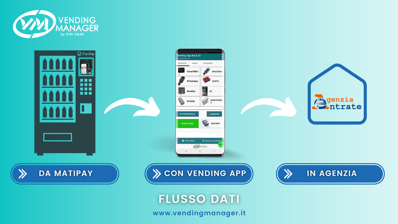 Da oggi si aggiungeil modulo MatiPay, che connesso direttamente al distributore permette di acquisire i dati direttamente attraverso Vending App e di trasmetterli automaticamente in Agenzia delle Entrate.