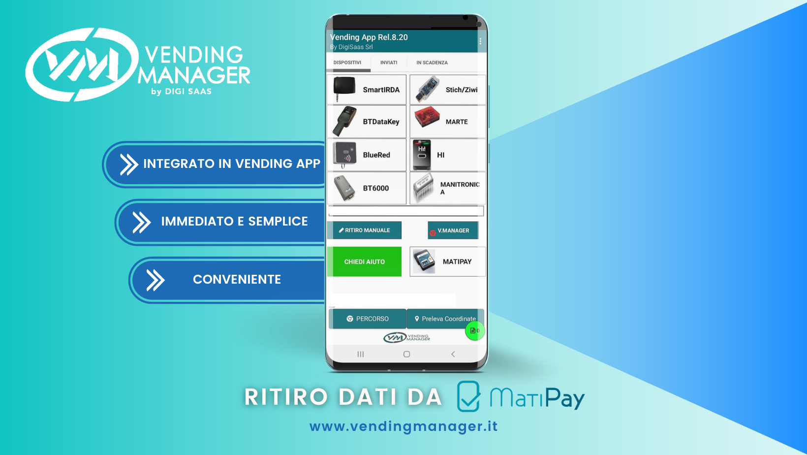 Questo aggiornamento è stato sviluppato da Vending Manager con l’obiettivo di rendere più rapida e più semplice la raccolta dei dati dai distributori automatici, con l’ulteriore vantaggio per i gestori di abbattere i costi di acquisto dei sistemi di pagamento, grazie al collegamento del modulo MatiPay al distributore, master dell’intera apparecchiatura.
